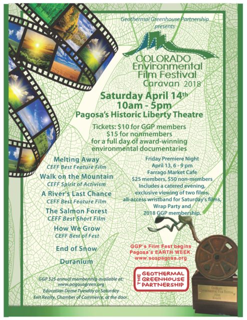 The Colorado Environmental Film Festival (CEFF) is an annual event held every February in Golden, Colorado. The Pagosa Springs Film Festival Caravan provides rural Coloradans an opportunity to sample the CEFF’s award-winning documentaries. In its eleventh year, the Pagosa Springs Caravan will be hosted at the Tennyson Event Center as a benefit for the Geothermal Greenhouse Partnership.